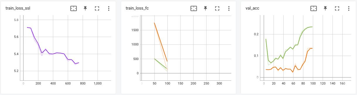 Left: SSL loss, while trainig, Center: Loss for fully connected layer, Right: Validation accuracy after each training epoch for the fc layer.