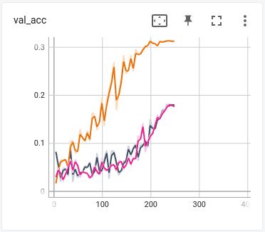 Switched to tutorial 2 but on CIFAR data. Smaller, maybe they will fit in my 6GB GPU! And they did! Some tiny learning was happening! Switched from MoCO to SimCLR and the classification accuracy raised from 0.34 to 0.38 with the validation accuracy of the SSL backbone consistently above the vanilla one! So, first win. SSL works for classification.