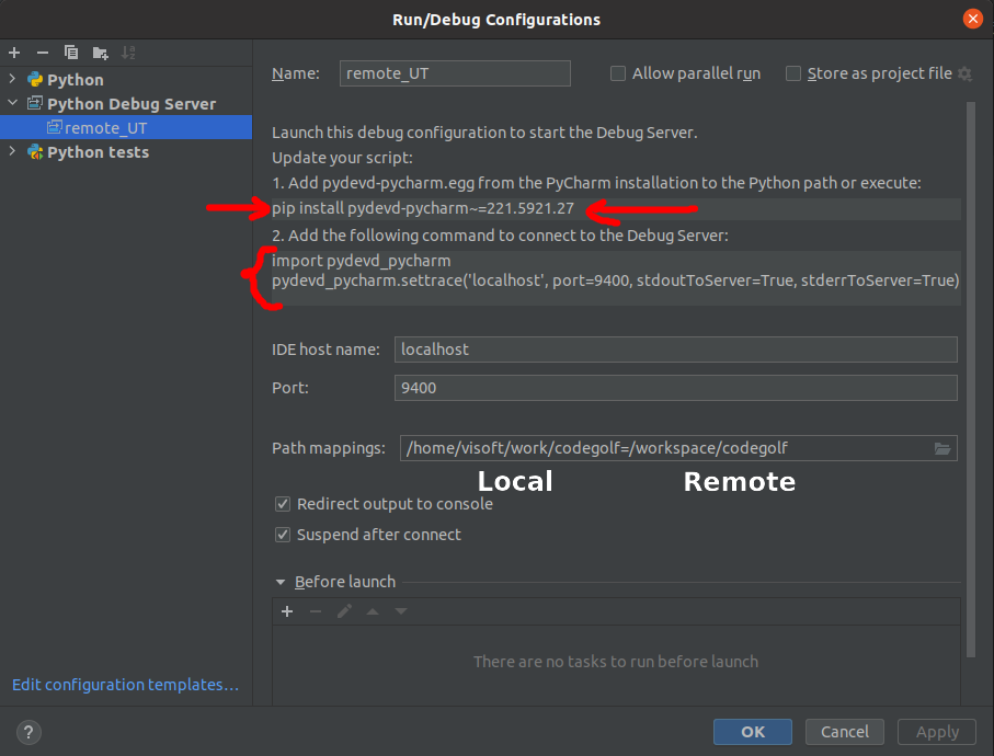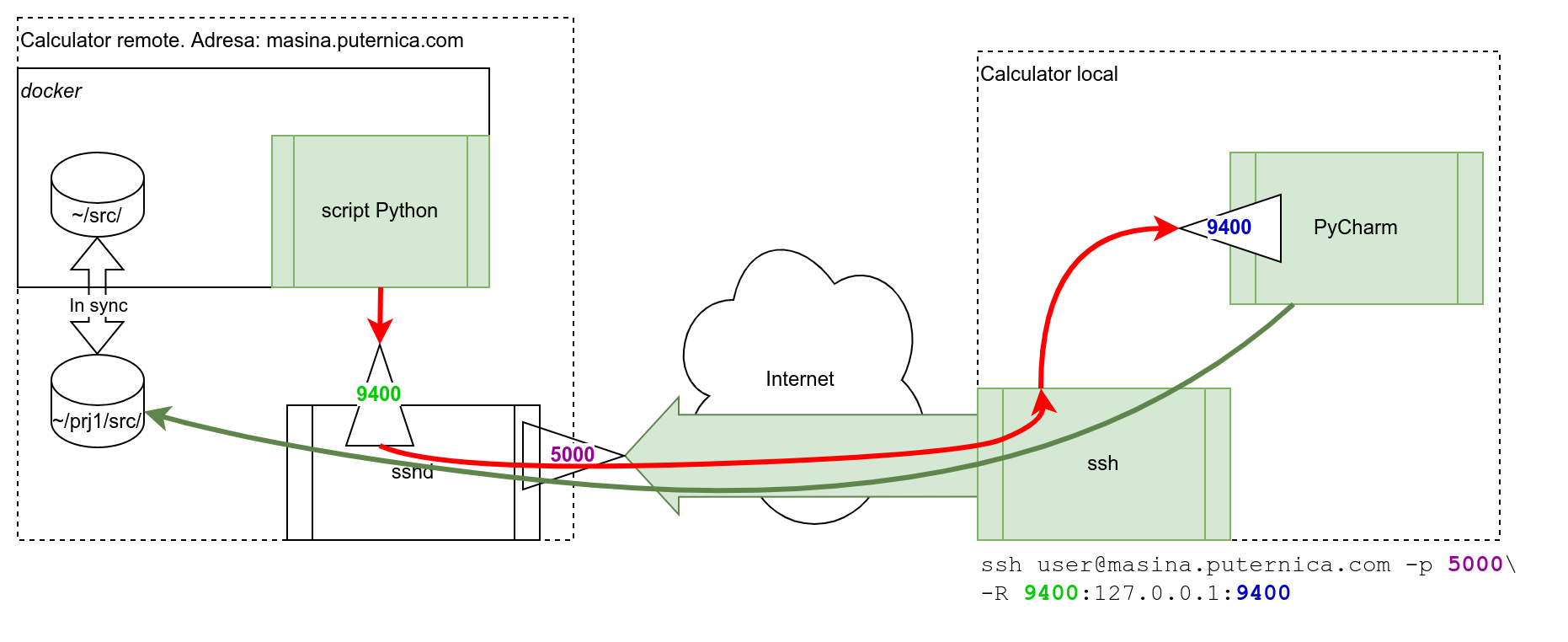 Filosofia aici este ca IDE-ul actioneaza ca un server, asteptand comenzi de la un client de debug, client ce ruleaza langa cod. Cum codul se executa remote, acest client de debug trebuie sa se execute si el remote. Apare necesitatea existentei unui canal de comunicare intre clientul de debug de pe masina remote si IDE-ul de pe masina noastra. Situatie ilustrata de linia rosie din figura de mai sus. Linia porneste din scripul de Python, se leaga la portul localhost:9400 care este forwardat la clientul de ssh de pe masina locala. Acesta, trimite cererile catre serverul localhost:9400 de pe masina locala (IDE-ul nostru).