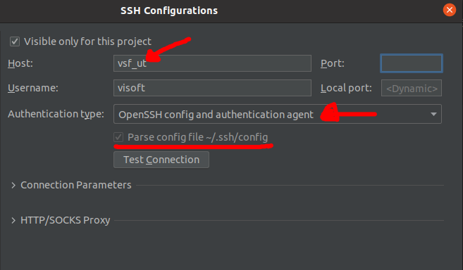 Setarile de SSH. Toate sunt scrise in fisierul .ssh/config. Precizati acest lucru si PyCharm stie sa le “preia” de acolo.