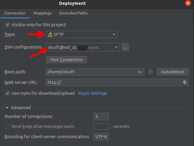 Pe langa asta, PyCharm trebuie sa poata sa actualizeze codul. Asta se face printr-o conexiune SFTP (conexiunea verde) Din fericire e suficient de specificat parametrii ssh si PyCharm-ul se descurca. Din cauza ca directorii cu cod sunt montati in docker, orice modificare din exterior se propaga in docker, automat.