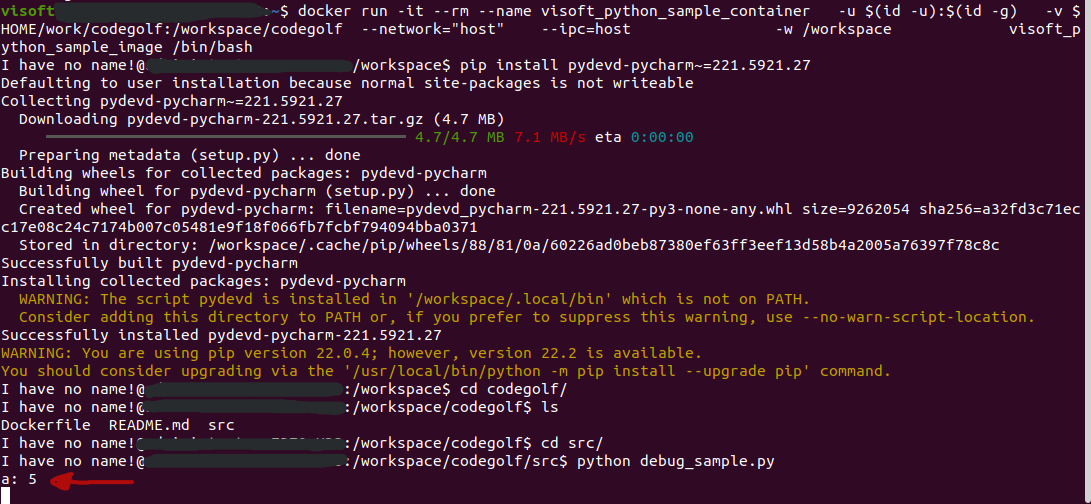docker run -it --rm --name visoft_python_sample_container \ -u $(id -u):$(id -g) \ -v $HOME/work/codegolf:/workspace/codegolf \ -p 127.0.0.1:9500:8888 \ --ipc=host \ -w /workspace \ visoft_python_sample_image /bin/bash