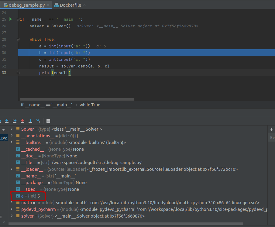 Acum PyCharm ar trebui sa intre in modul debug si sa va lase sa executati codul linie cu linie. Pentru codul de demo din documentatie, input-ul se realizeaza in consola docker!